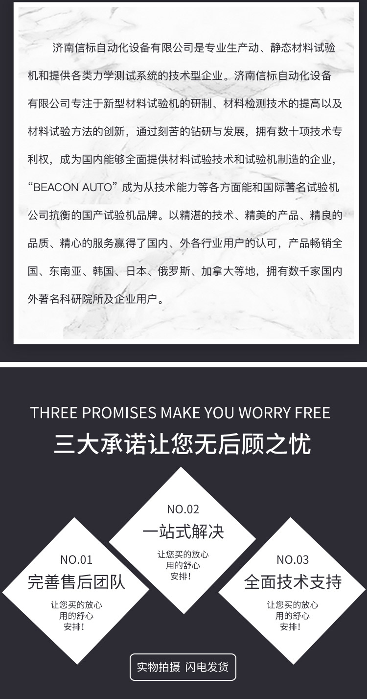 濟南信標自動化設備有限公司主要生產:動靜態萬能疲勞試驗機,接骨板彎曲試驗機,縫合線拉伸疲勞試驗機,髖膝關節磨損試驗機,電子萬能試驗機、液壓萬能試驗機、巖石三軸、四軸,電液拉力試驗機,材料試驗機,高低溫蠕變,高低頻疲勞,拉伸、扭轉、杯突等二十多個系列兩千多個的品種。